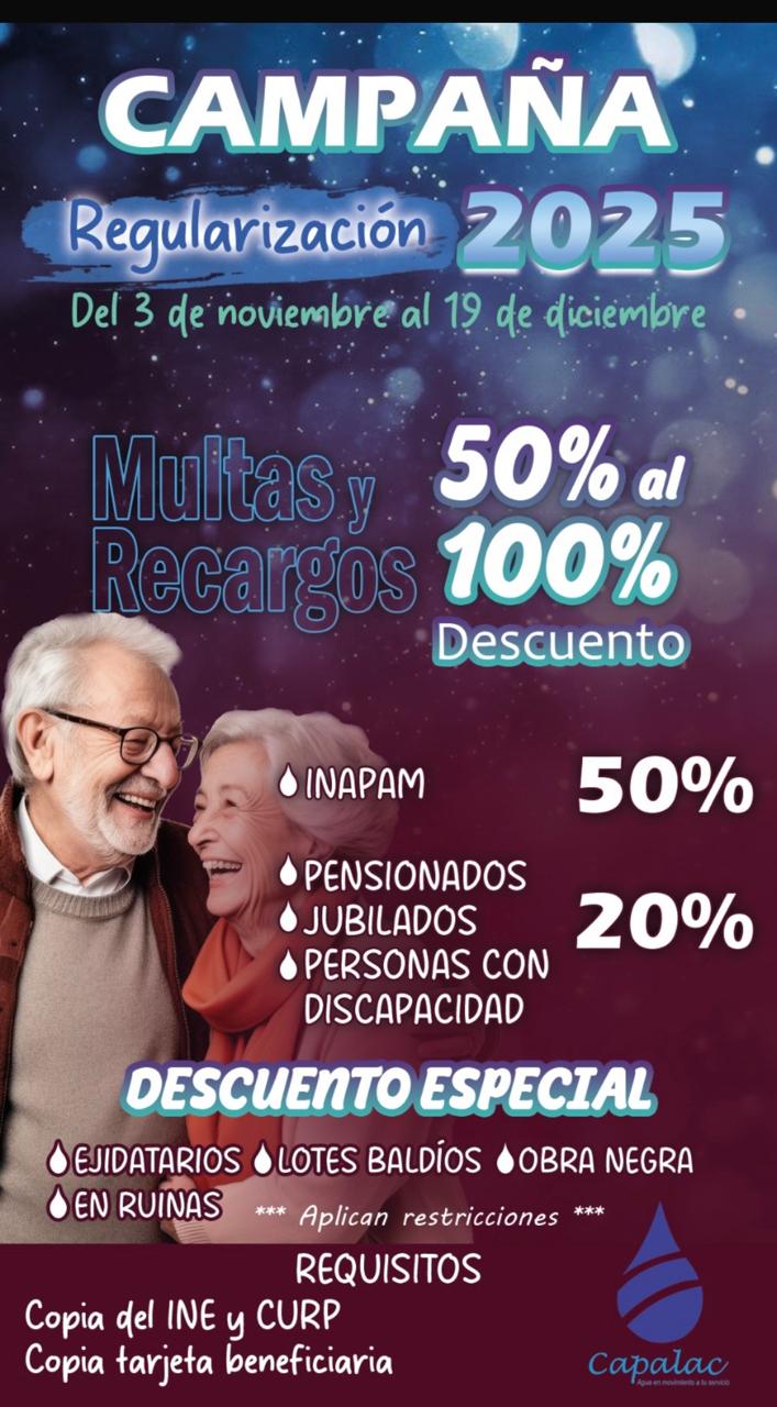 Cd. Lázaro Cárdenas, Michoacán, a 03 de noviembre de 2025.- El Comité de Agua Potable y Alcantarillado de Lázaro Cárdenas (Capalac) dio inicio a la Campaña de Regularización 2025, la cual se llevará a cabo del 3 de noviembre al 19 de diciembre, ofreciendo descuentos del 50 al 100 por ciento en multas y recargos a los usuarios que se pongan al corriente con su servicio.