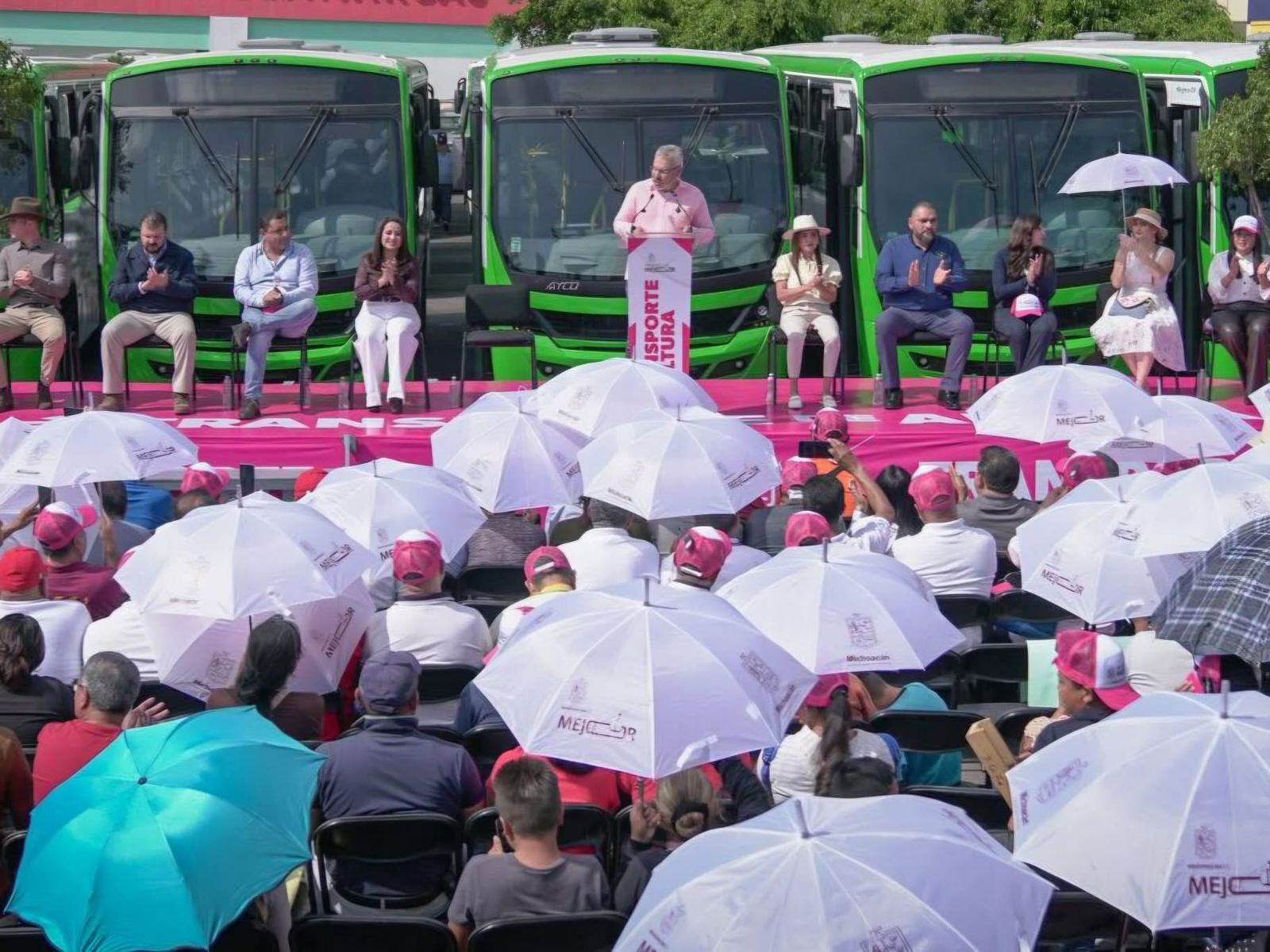 Uruapan, Michoacán, 5 de diciembre de 2025.- El gobernador Alfredo Ramírez Bedolla entregó en Uruapan las primeras 80 unidades nuevas a colectivos del transporte público urbano, con lo que se convierte en el primer municipio de Michoacán en implementar el Sistema Integrado de Transporte como parte del programa de modernización.