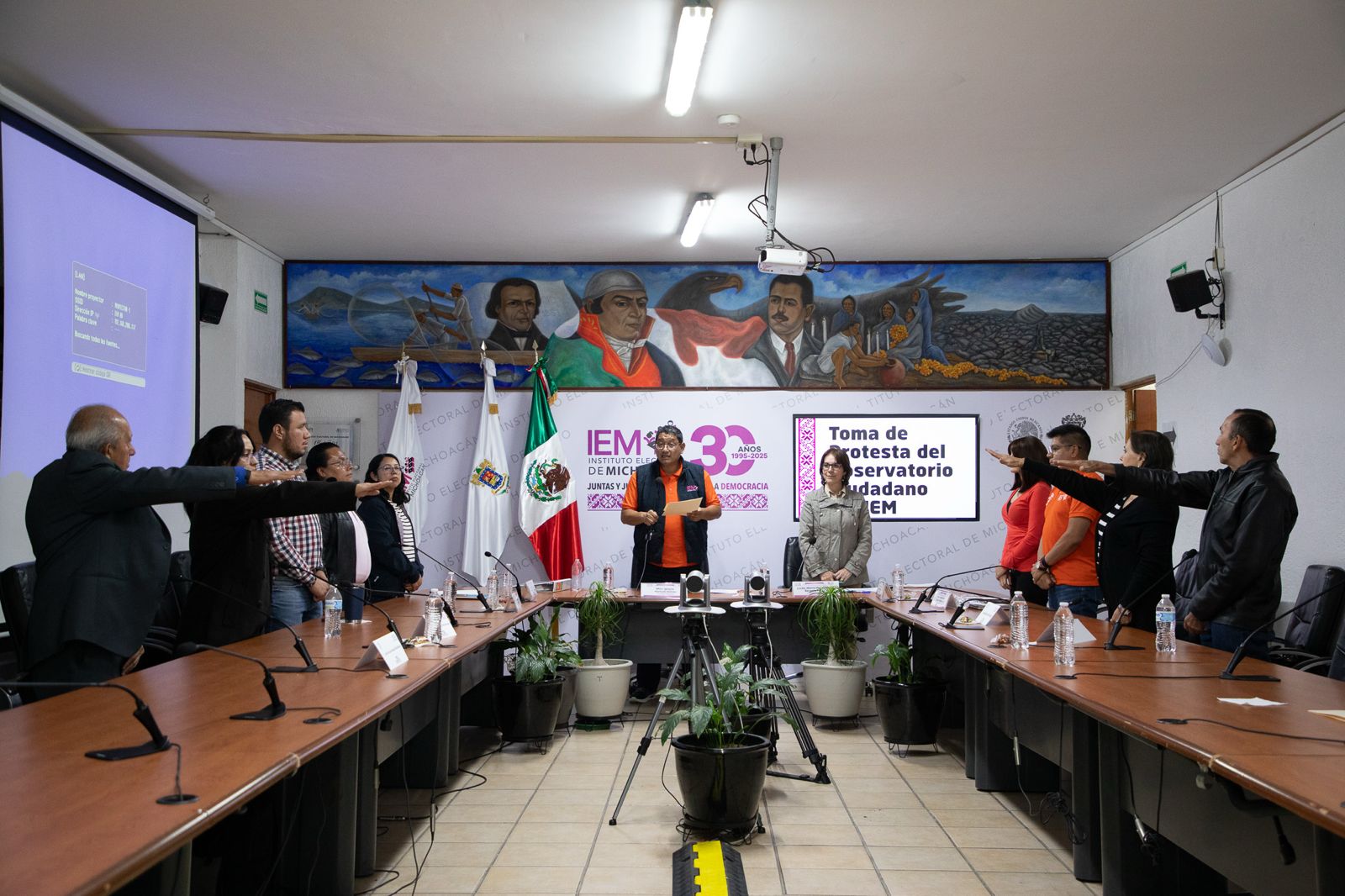 Morelia, Michoacán, jueves 25 de junio de 2025. En cumplimiento de la normativa electoral y con el objetivo de fortalecer la participación de la ciudadanía en los asuntos públicos, el Instituto Electoral de Michoacán (IEM) llevó a cabo la toma de protesta de las y los integrantes de su Observatorio Ciudadano