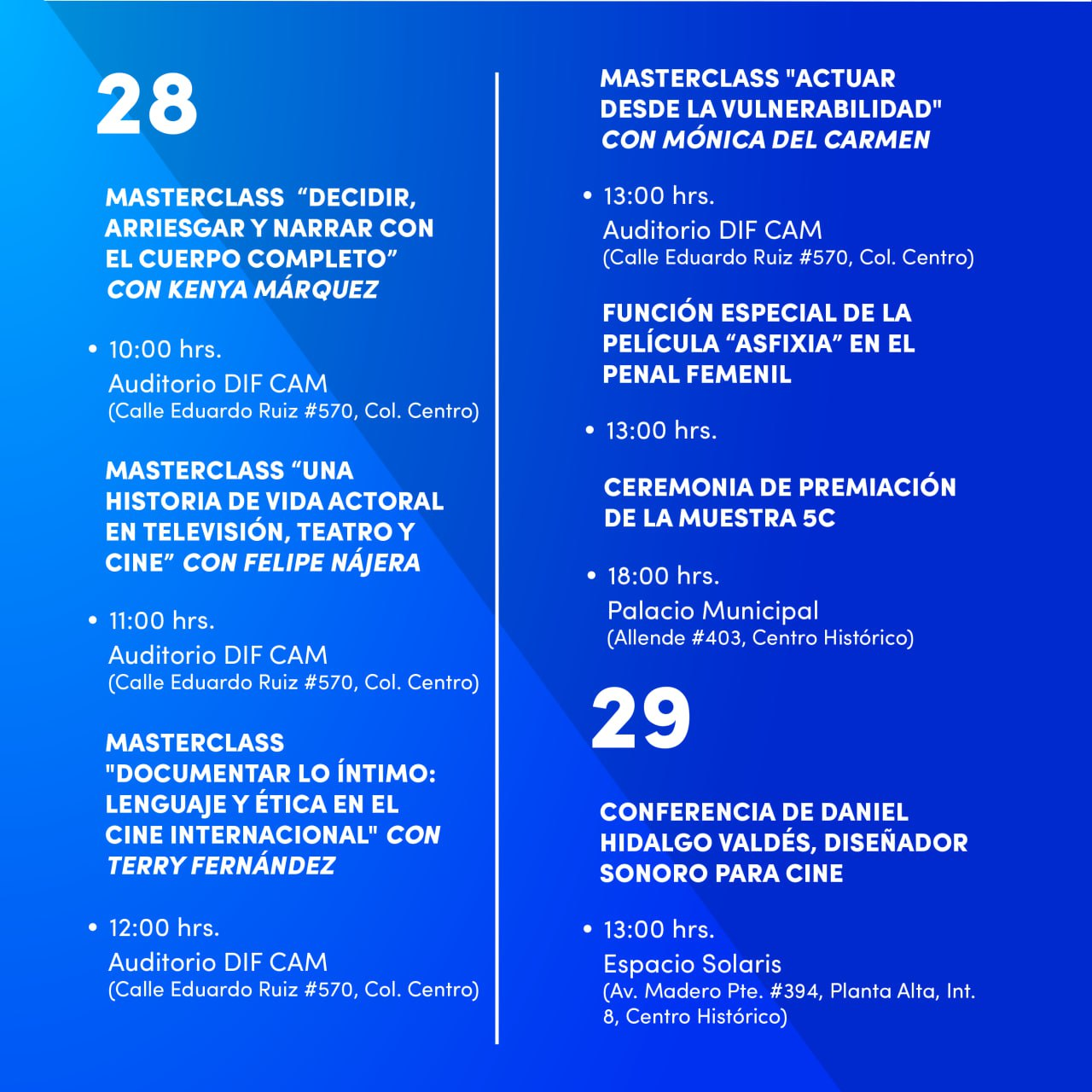 A lo largo de la semana también habrá talleres, masterclasses, charlas, mesas de diálogo y “networking” (redes de relaciones y negocios) a cargo de reconocidos especialistas de la industria cinematográfica, como los actores Felipe Nájera y Harold Torres, además de Terry Fernández y Mónica del Carmen, entre otros.