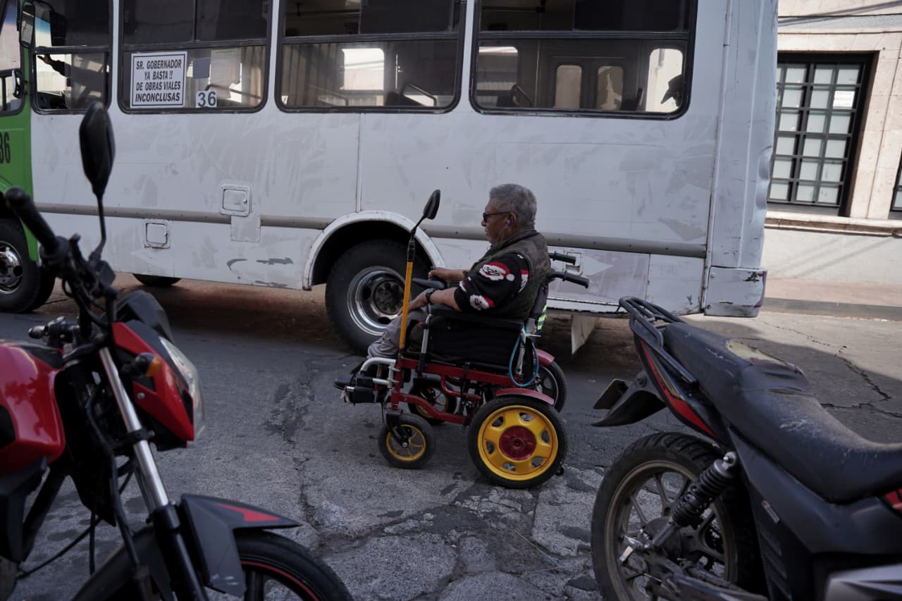 José vive cerca del Panteón Municipal, y aunque no sale a diario al Centro, su silla de ruedas es su único transporte para recorrer poco más de 3 kilómetros, la pila dice, le rinde bien, pero a falta de transporte público toca «campechanear» entre banquetas y carriles vehiculares.