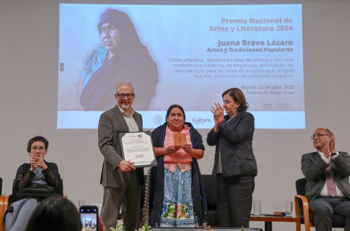 Ciudad de México, México, 22 de julio de 2025.- La maestra cocinera tradicional y maestra artesana, Juana Bravo Lázaro, recibió este día el Premio Nacional de Artes y Literatura 2024, en la categoría de Artes y Tradiciones Populares, teniendo como escenario el Palacio de Bellas Artes, en la Ciudad de México.