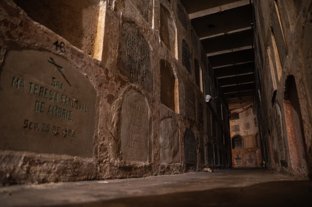 La humedad es constante. Se percibe en el olor, en las paredes y en el piso irregular. El calor se acumula conforme se avanza y la iluminación es mínima, apenas suficiente para distinguir las lápidas y los pasillos; caminar solo ahí abajo no resulta sencillo, pues el silencio pesa y cada paso resuena.