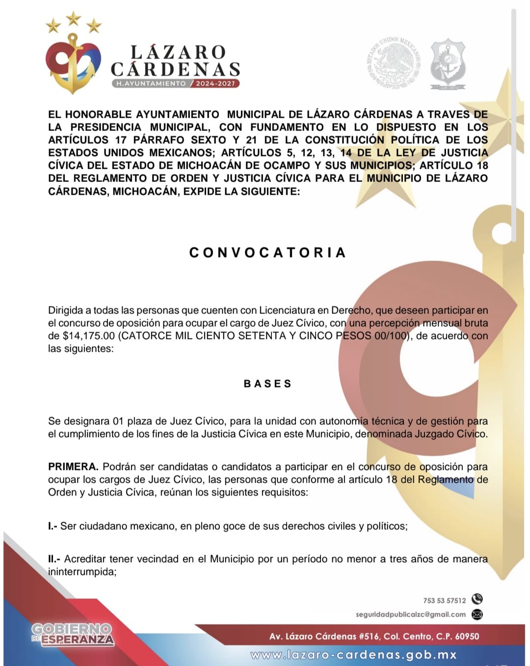 Cd. Lázaro Cárdenas, Mich., a 09 de marzo del 2026.- El H. Ayuntamiento de Lázaro Cárdenas emitió la convocatoria dirigida a profesionistas en Derecho interesados en participar en el concurso de oposición para ocupar la plaza de Juez Cívico, cargo que forma parte del sistema de Justicia Cívica del municipio.