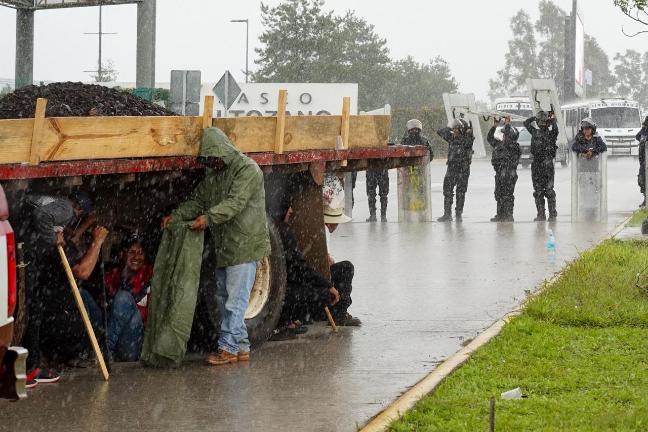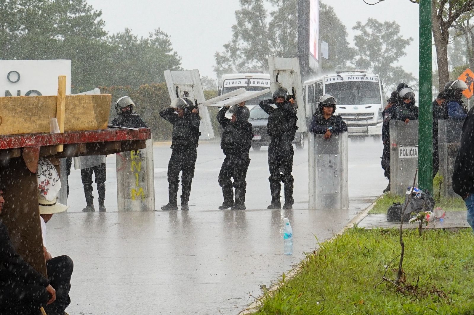Los policías antimotines (AROP) se protegen de la intensa lluvia con sus escudos mientras mantienen la vigilancia en el bloqueo de la vialidad.