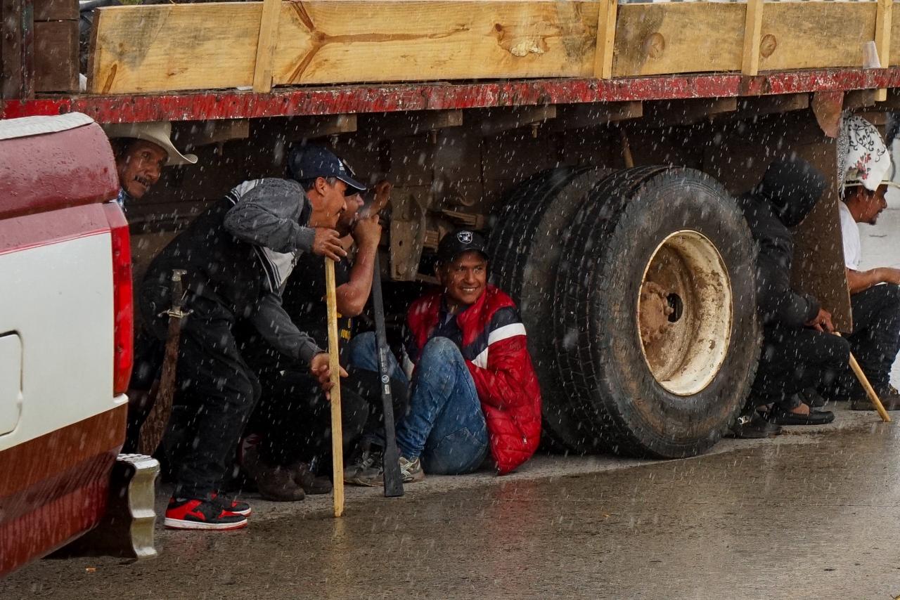 Resguardados en el camión, entre lluvia y risas los protestantes resisten en compañía.
