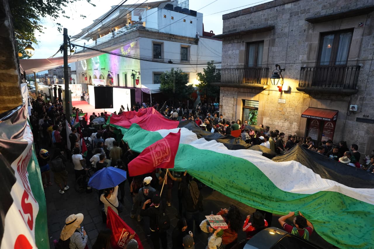 El contingente, integrado por decenas de manifestantes, partió desde la Fuente de Las Tarascas con rumbo al Palacio de Gobierno, donde corearon consignas y desplegaron pancartas con mensajes de solidaridad hacia Palestina. Más tarde, el grupo avanzó por las principales calles del centro histórico hasta llegar al Cinépolis Centro, sede del festival, con el propósito de que su mensaje fuera escuchado por los asistentes y medios internacionales que cubrían el evento.