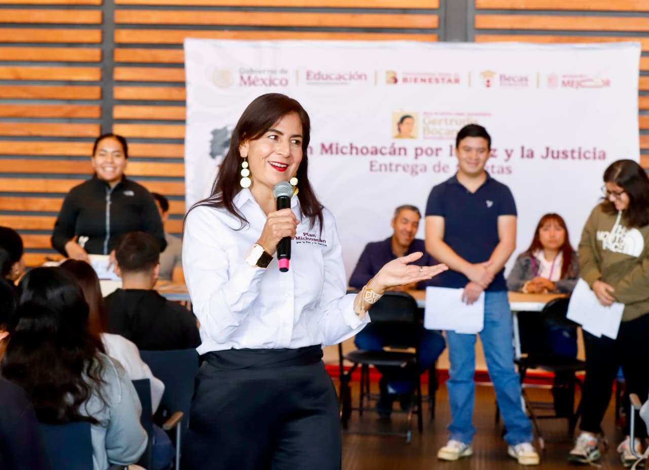 Morelia, Michoacán, 18 de febrero de 2026.- Gracias al compromiso de la presidenta Claudia Sheinbaum Pardo, hoy miles de jóvenes reciben su tarjeta de la Beca Gertrudis Bocanegra, como parte esencial del Plan Michoacán por la Paz y la Justicia, cuyo corazón es la educación, señaló la secretaria Gabriela Molina, al encabezar la entrega a estudiantes de Veterinaria de la Universidad Michoacana de San Nicolás de Hidalgo (UMSNH).