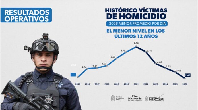 Morelia, Michoacán, 6 de marzo de 2026.- En lo que va del 2026, Michoacán registra una tendencia histórica a la baja con un promedio diario de 2.47 víctimas de homicidio doloso, siendo la menor cifra en los últimos 12 años, así lo detalló el gobernador Alfredo Ramírez Bedolla.