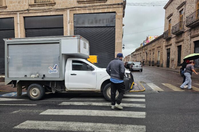 Morelia, Mich. | ACG.- Los cruces peatonales de las calles del centro histórico de la capital michoacana, de manera constante, son invadidos por automovilistas, ya sean particulares o del transporte público, permanentemente o de manera espaciosa, sin que ninguna autoridad haga presencia y valor el marco jurídico correspondiente. En la imagen, una camioneta de la empresa Guna en forma iegal ocupa la esquina de Abasolo y Corregidora, un sitio en que debería estar libre para el paso de los ciudadanos de a pie.
