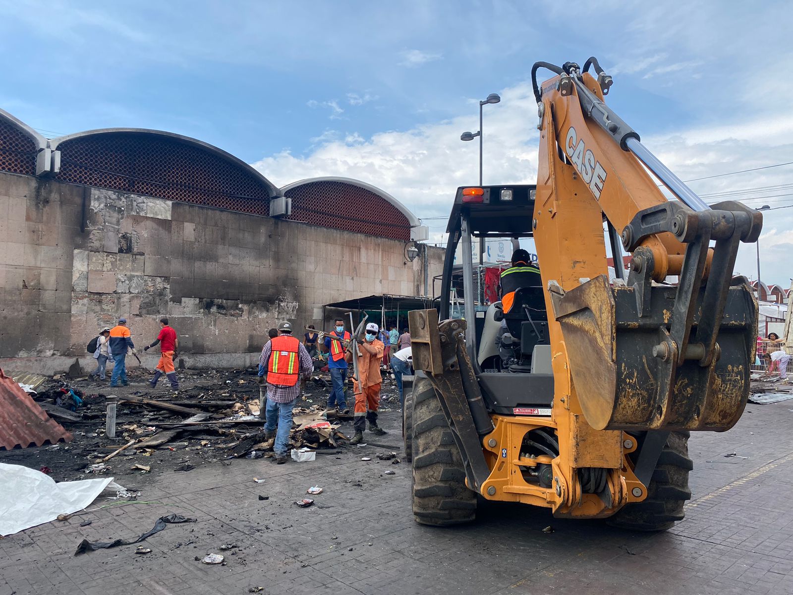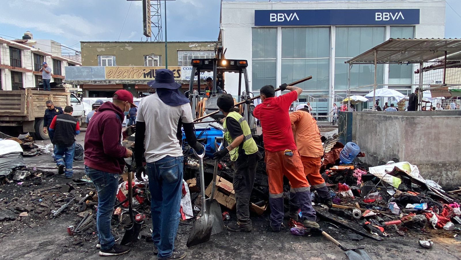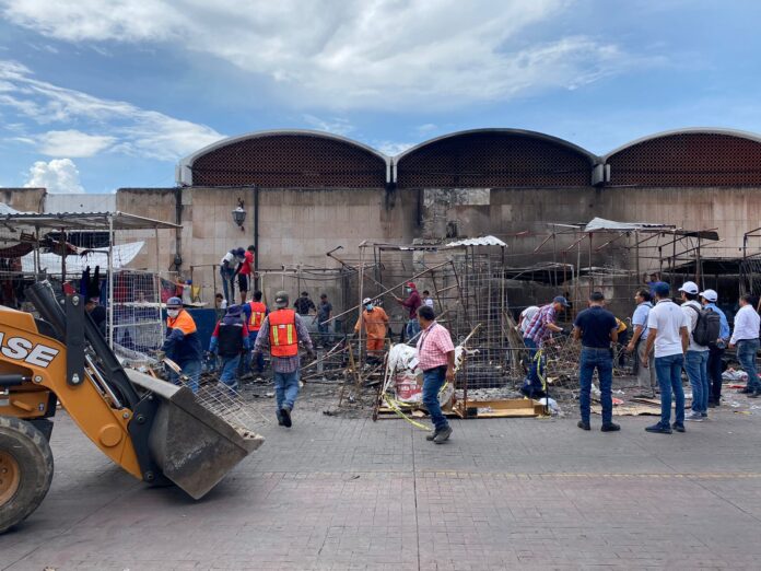 Morelia, Mich. | Acueducto Online.- Poco más de 3 toneladas de residuos fueron retirados del exterior del mercado Independencia luego del incendio que se registró esta madrugada en el exterior del inmueble y que consumió 21 puestos semifijos.