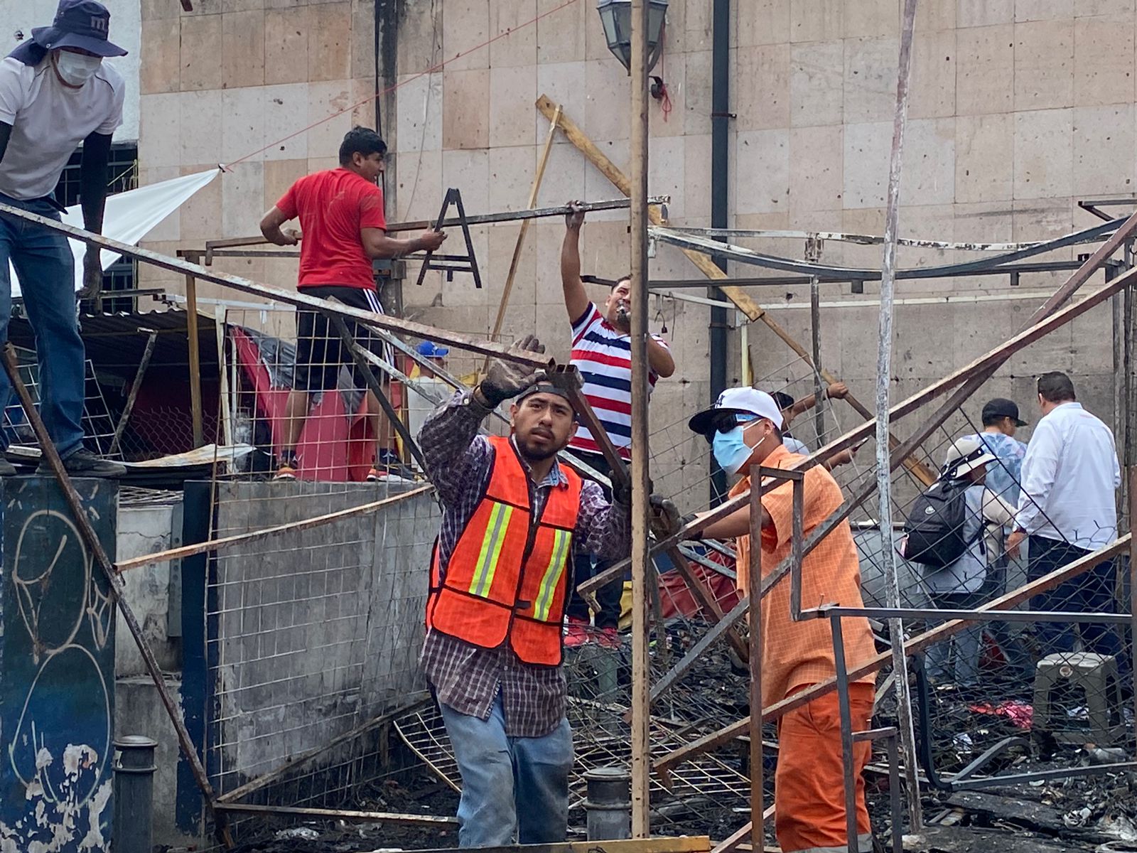 A partir de las 15:00 horas, las brigadas de la Dirección de Residuos Sólidos y Mercados iniciaron con el retiro de láminas y estructuras metálicas de 21 locales semifijos de diversos giros.