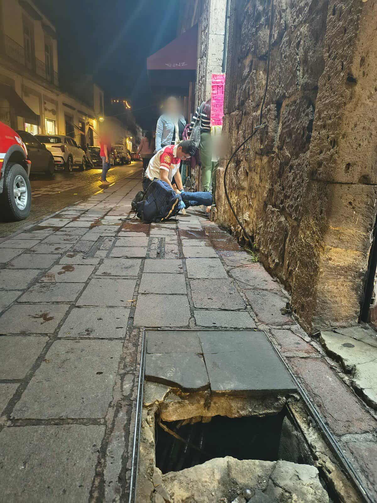 Morelia, Mich.- Domingo 12 de octubre de 2025.- Una transeúnte quedó herida tras caer a un registro luego de que la tapa de laja de cantera se rompió, accidente ocurrido en una de las banquetas del centro histórico de Morelia.