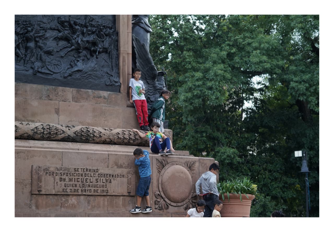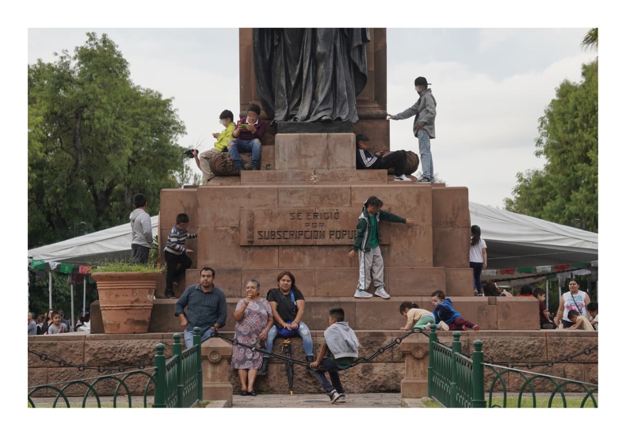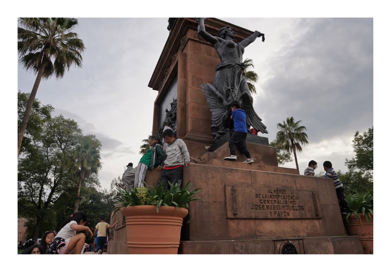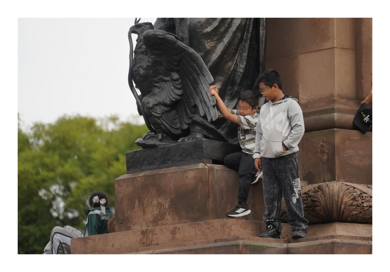 El monumento ecuestre de José María Morelos, conocido como “El Caballito”, se convirtió en su escenario improvisado. Entre risas y esfuerzo, los pequeños treparon el podio de cantera; algunos llegaron hasta las figuras femeninas que acompañan al héroe insurgente, mientras que otros se quedaron a mitad del camino, aferrados a la piedra como si libraran una pequeña gran batalla.