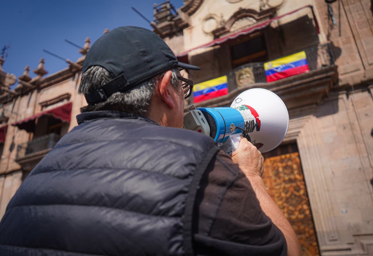 Morelia, Mich. | Agencia ACG.- Integrantes de la Coordinadora de Colectivos, Activistas y Organizaciones Sociales (CCAOS) realizaron una protesta frente a Palacio de Gobierno en rechazo a la intervención del gobierno de Estados Unidos en Venezuela y a lo que consideran una amenaza para otros países de América Latina, incluido México.