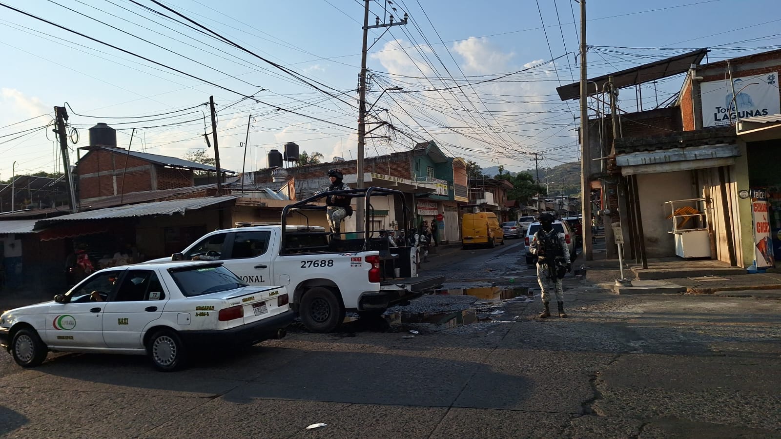 Oficiales de los tres órdenes de gobierno realizaron un operativo en busca de los responsables del ataque, quienes escaparon a bordo de una motocicleta de acuerdo con testigos, pero no lograron ubicar su paradero.