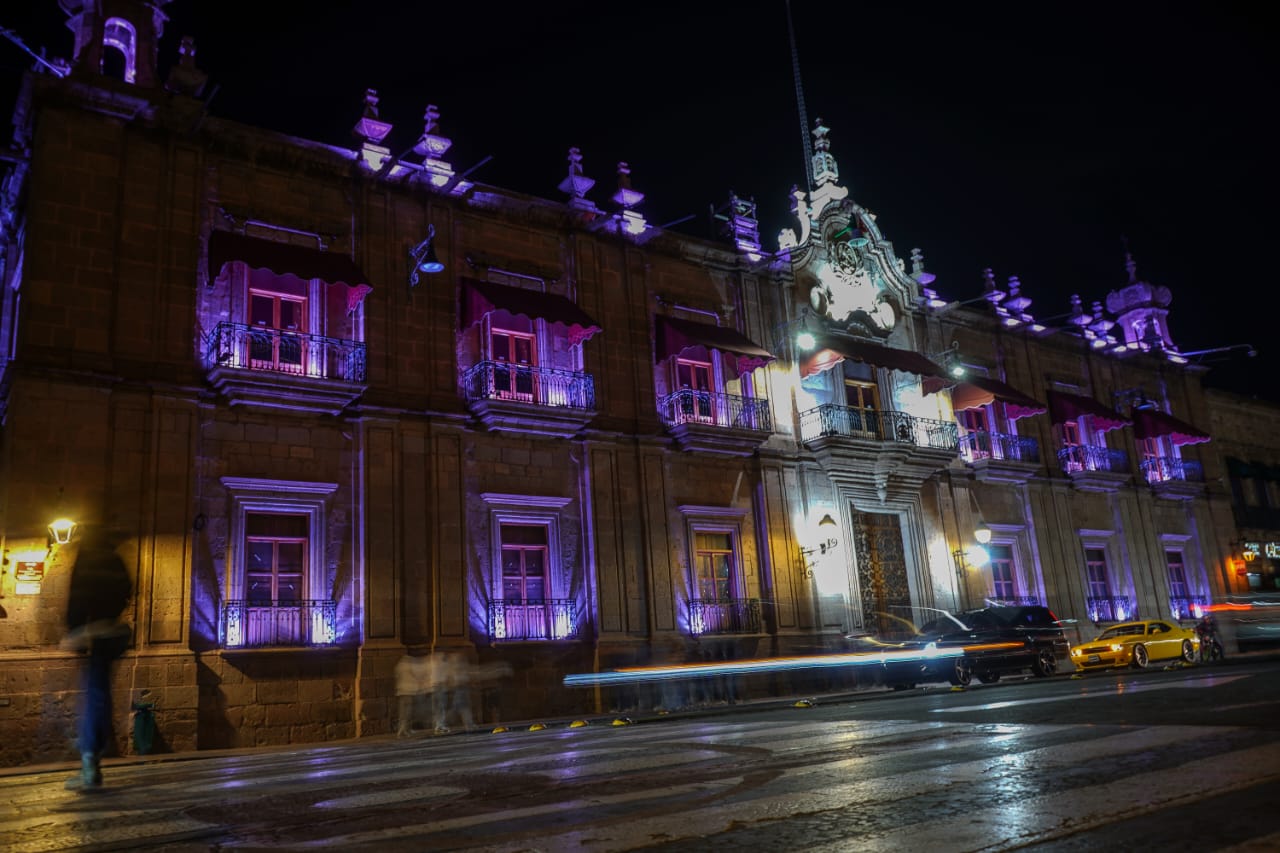 Morelia, Mich., A Domingo 1 de Marzo del 2026 | Agencia ACG.- Como parte de las acciones relacionadas con el marco del Día Internacional de la Mujer, el Palacio de Gobierno en Morelia fue iluminado con luz morada durante la noche de este Domingo primero de marzo, color asociado a la lucha por los derechos de las mujeres y la equidad de género.