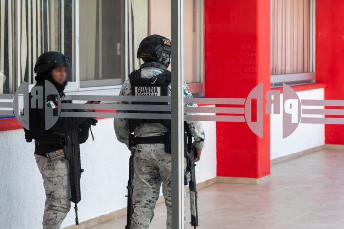 Morelia, Mich. | Humberto Castillo Mercado/ACG.- Al menos una decena de elementos de la Guardia Nacional, así como dos vehículos de esta corporación federal, resguardan las instalaciones del Comité Directivo Estatal del Partido Revolucionario Institucional (PRI), previo a la realización de su rueda de prensa semanal.