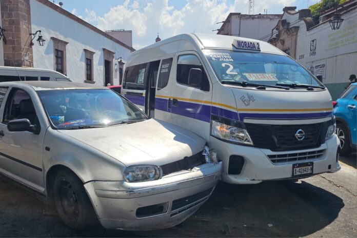 Morelia, Mich. | Redacción ACG.- Un Volkswagen gris y una combi de la Ruta Morada chocaron en la esquina de la Plaza del Carmen, presuntamente luego de que el vehículo particular se incorporara desde un espacio donde estaba estacionado en zona prohibida, justo en el giro que conecta Eduardo Ruiz con Benito Juárez.