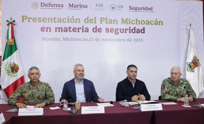 Morelia, Michoacán, 13 de noviembre de 2025.- En reunión sostenida en el cuartel de la 21 Zona Militar, el gobernador Alfredo Ramírez Bedolla; el secretario de Seguridad y Protección Ciudadana, Omar García Harfuch; el titular de la Secretaría de la Defensa Nacional, Ricardo Trevilla Trejo, y la Secretaría de Marina, revisaron la estrategia de seguridad y prevención al delito para reforzar las acciones del Plan Michoacán por la Paz y la Justicia.