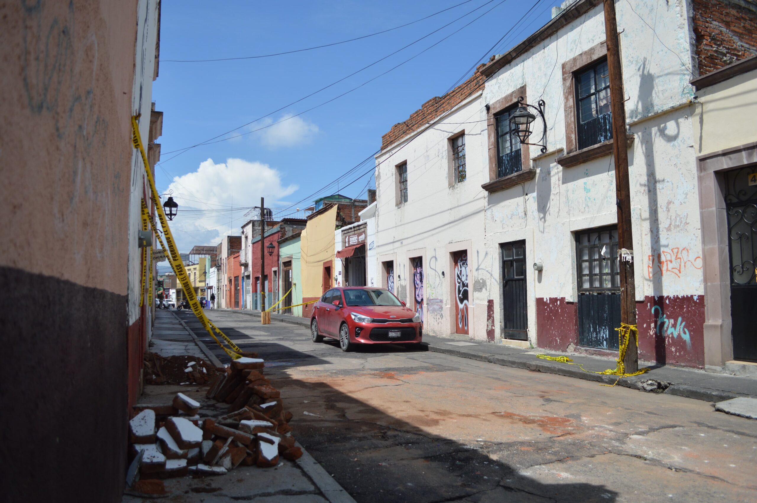 Morelia, Mich. | Alberto Barrera/ACG.- La calle Nicolás Bravo, en la esquina con Manuel Muñiz, en el Centro Histórico, se encuentra cerrada debido al riesgo de derrumbe en un par de inmuebles.