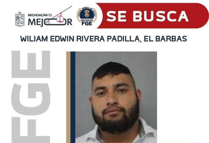 Morelia, Michoacán, a 26 de junio de 2025.– Como resultado de los trabajos de investigación que lleva a cabo la Fiscalía General del Estado de Michoacán (FGE), se logró establecer la presunta responsabilidad de William Edwin Rivera Padilla, el Barbas, en el delito de secuestro agravado, por lo que se ha emitido acuerdo de ofrecimiento de recompensa para quien proporcione información veraz y útil que conduzca a su detención.