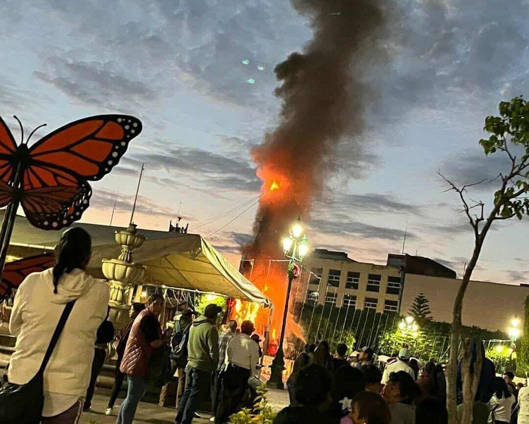 Zitácuaro, Mich.- Miércoles 10 de diciembre de 2025.- Derivado del asesinato de la joven Ángeles Esquivel, de 24 años de edad, ocurrido el pasado domingo 07 de diciembre en la colonia Infonavit y en el que está presuntamente implicado un oficial de Tránsito Municipal de Zitácuaro, un grupo de manifestantes salió a las calles de la ciudad para exigir justicia y, durante la acción, quemaron el árbol navideño ubicado en la Plaza Cívica Benito Juárez.