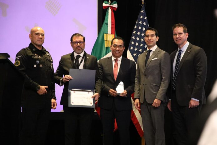 José Vega, oficial adjunto del Programa INL (Oficina de Asuntos Internacionales de Narcóticos y Aplicación de la Ley), y Shawn Morrow, subdirector adjunto de Agencia de Alcohol, Tabaco, Armas de Fuego y Explosivos (ATF), entregaron el reconocimiento al titular de la SSP Juan Carlos Oseguera Cortés, y al Fiscal General del Estado, Adrián López Solís, por la dedicación de ambas instituciones para consolidar un entorno de mayor tranquilidad en el estado.