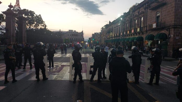 Morelia, Michoacán, 2 de noviembre de 2025.- El Palacio de Gobierno se encuentra resguardado por elementos de seguridad estatal, luego de los actos vandálicos registrados esta tarde en el Centro Histórico de Morelia, informó el secretario de Gobierno, Raúl Zepeda Villaseñor.