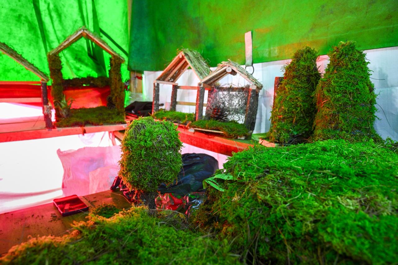 Rogelio elabora cada pieza desde cero: compra la madera, corta, arma y decora. Las casitas —o “portalitos”, como él las llama— llevan alrededor de una hora de trabajo, aunque las más pequeñas llegan a demandar hasta dos. Las cubre con musgo, pasto seco y pequeñas plantas del cerro que él conoce como gallitos. Los arbolitos, que se han vuelto de lo más llamativo de su puesto, llevan una técnica particular: por dentro se rellenan con material seco para dar volumen y sobre la superficie se coloca musgo fresco que, con un poco de agua, se esponja y mantiene su color verde por semanas, incluso meses. Con buenos cuidados, asegura, pueden durar hasta dos años.