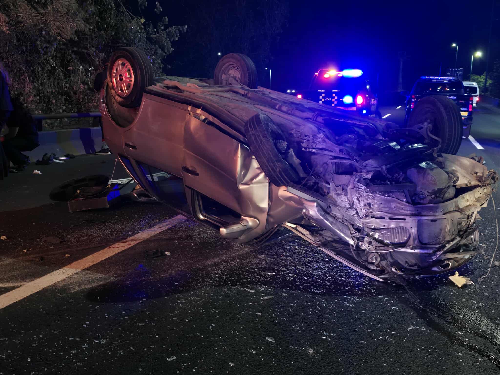 De acuerdo con autoridades policiales, el citado vehículo es un Volkswagen Pointer, color plata, cuyo cofre se levantó durante el trayecto, entonces le obstruyó la visibilidad del conductor, por lo que la unidad se estrelló contra un muro de contención y terminó volcada.