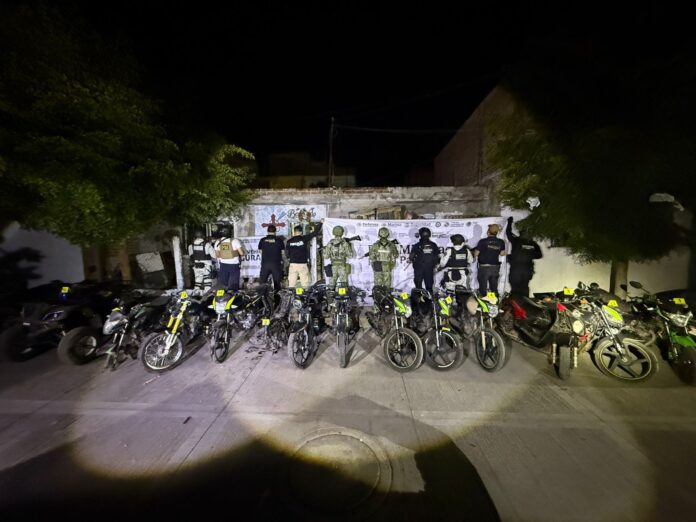 Jacona, Michoacán, 25 de diciembre de 2025.- En una acción interinstitucional, elementos de las secretarías de Seguridad Pública (SSP) y de la Defensa Nacional (Defensa), así como la Guardia Nacional (GN), dieron acompañamiento a una orden de cateo que cumplimentó la Fiscalía General del Estado (FGE) en un inmueble en Jacona, donde se recuperaron 11 motocicletas robadas.