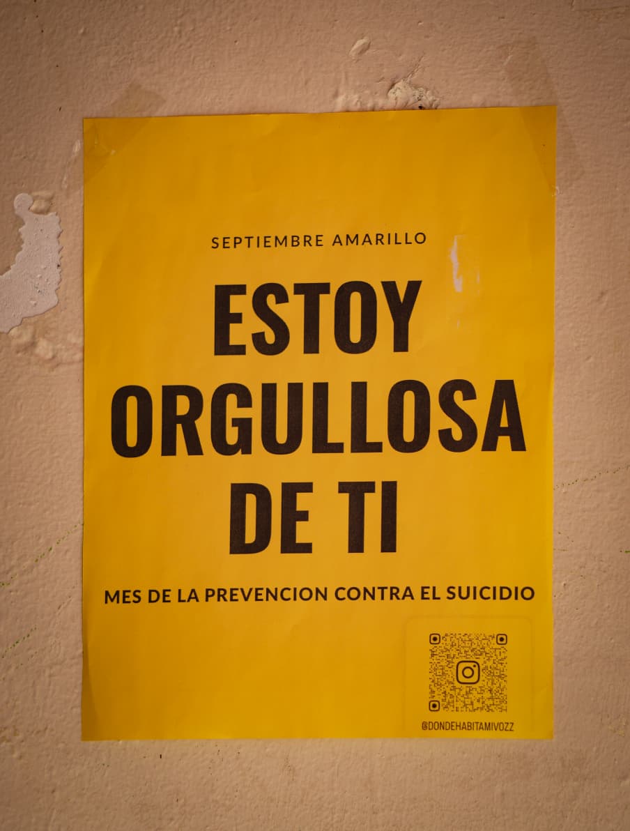 Los carteles también incluyen un código QR que dirige al Instagram del taller de sanación psicológica Donde Habita Mi Voz, donde se comparten mensajes y recursos relacionados con el cuidado emocional.