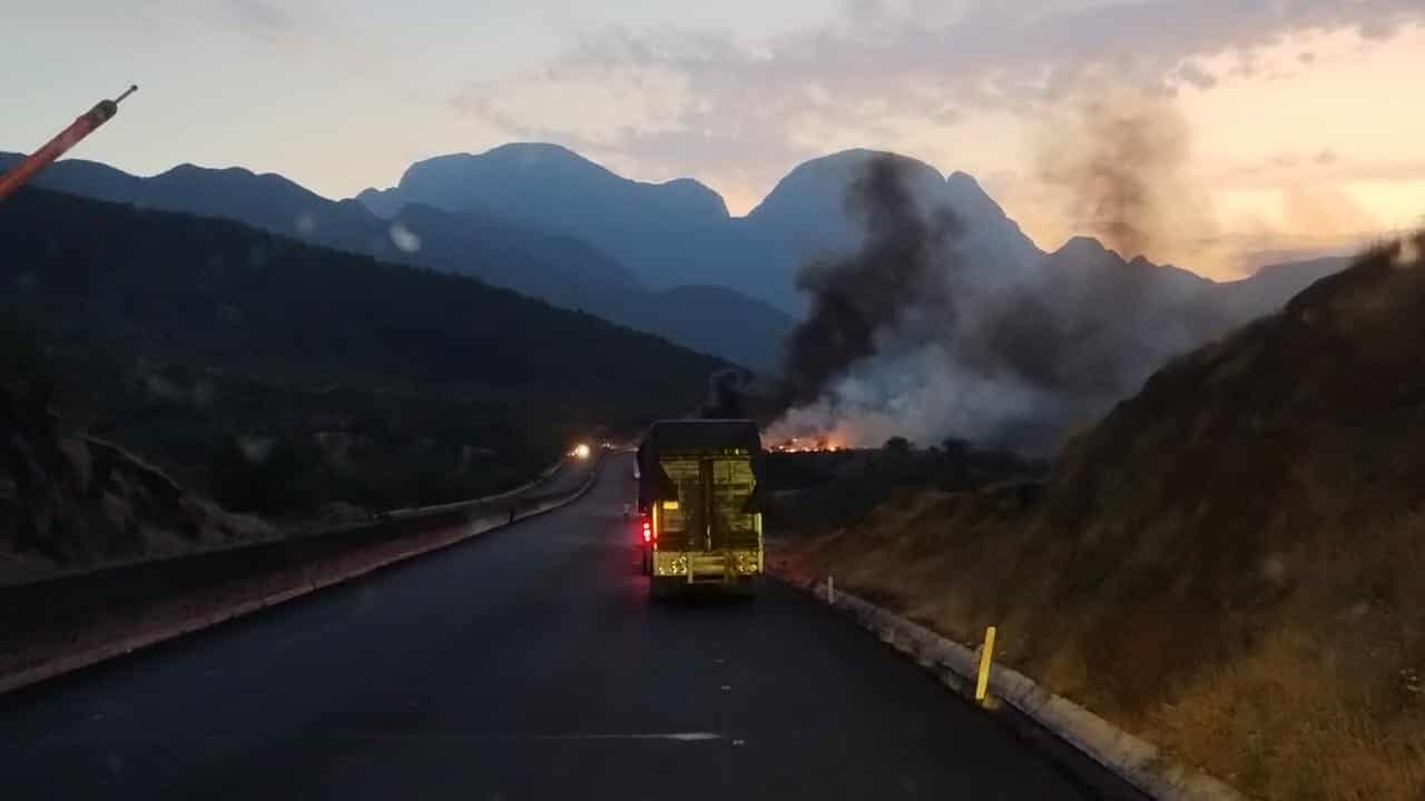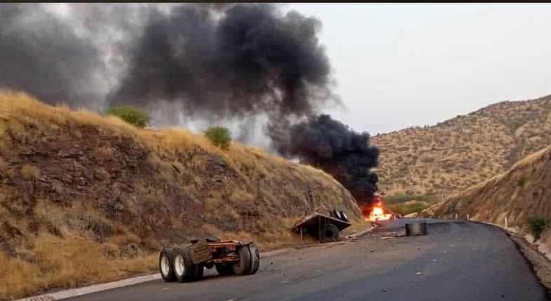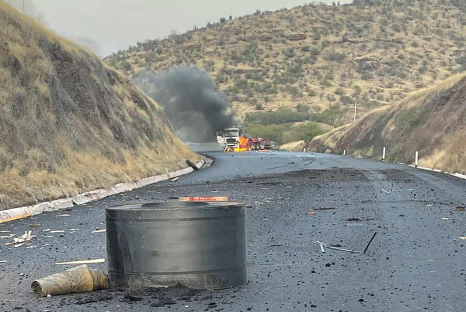 La Huacana, Mich.- 18 de noviembre de 2025.- Un tráiler que transportaba rollos de acero, chocó contra un objeto fijo y enseguida se incendió, provocando el cierre parcial de la autopista Siglo XXI.