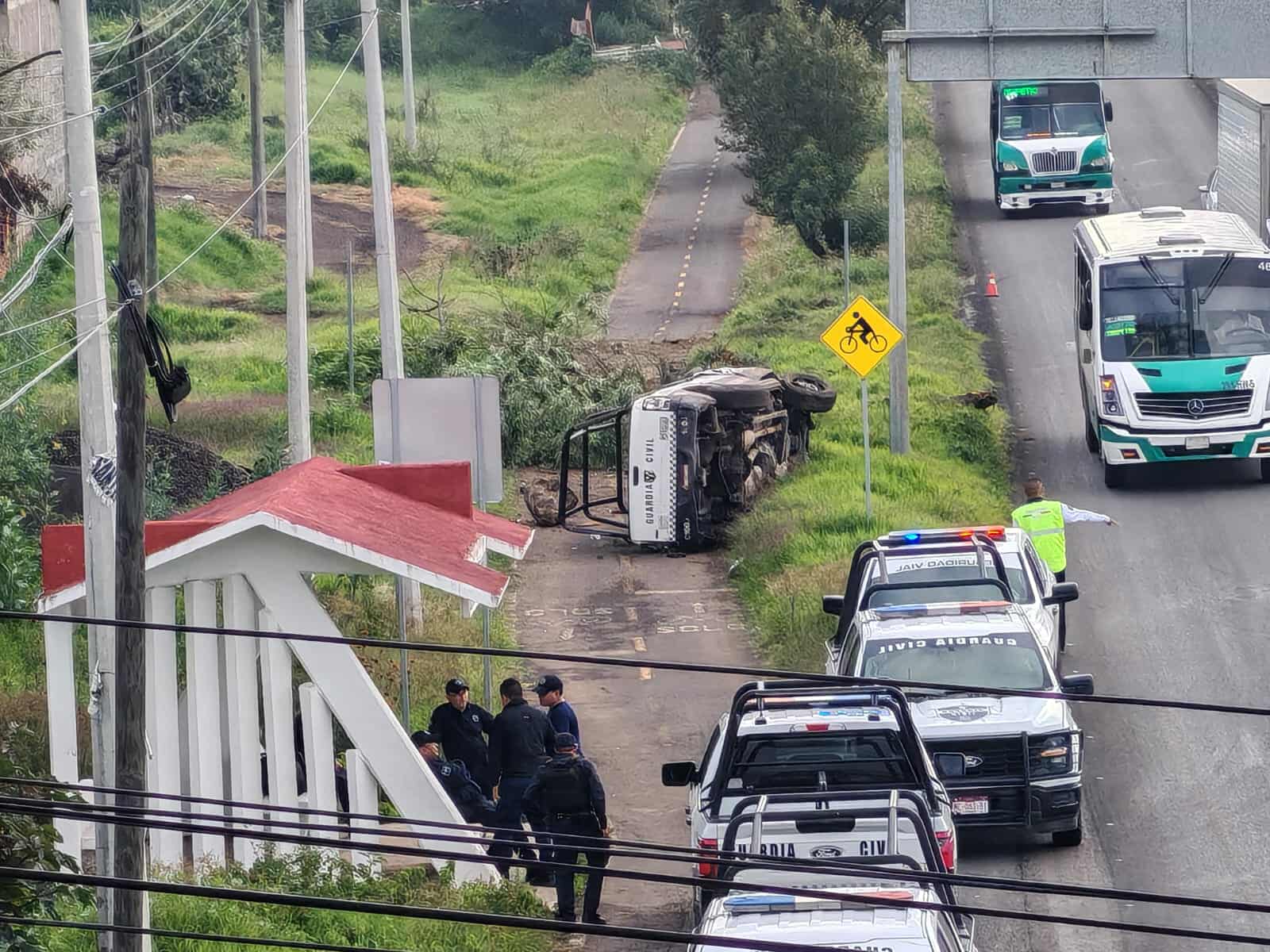 Hasta el sitio se trasladaron oficiales de la Guardia Civil y paramédicos para auxiliar al tripulante de la unidad policial, mismo que por fortuna solo presenta golpes leves.