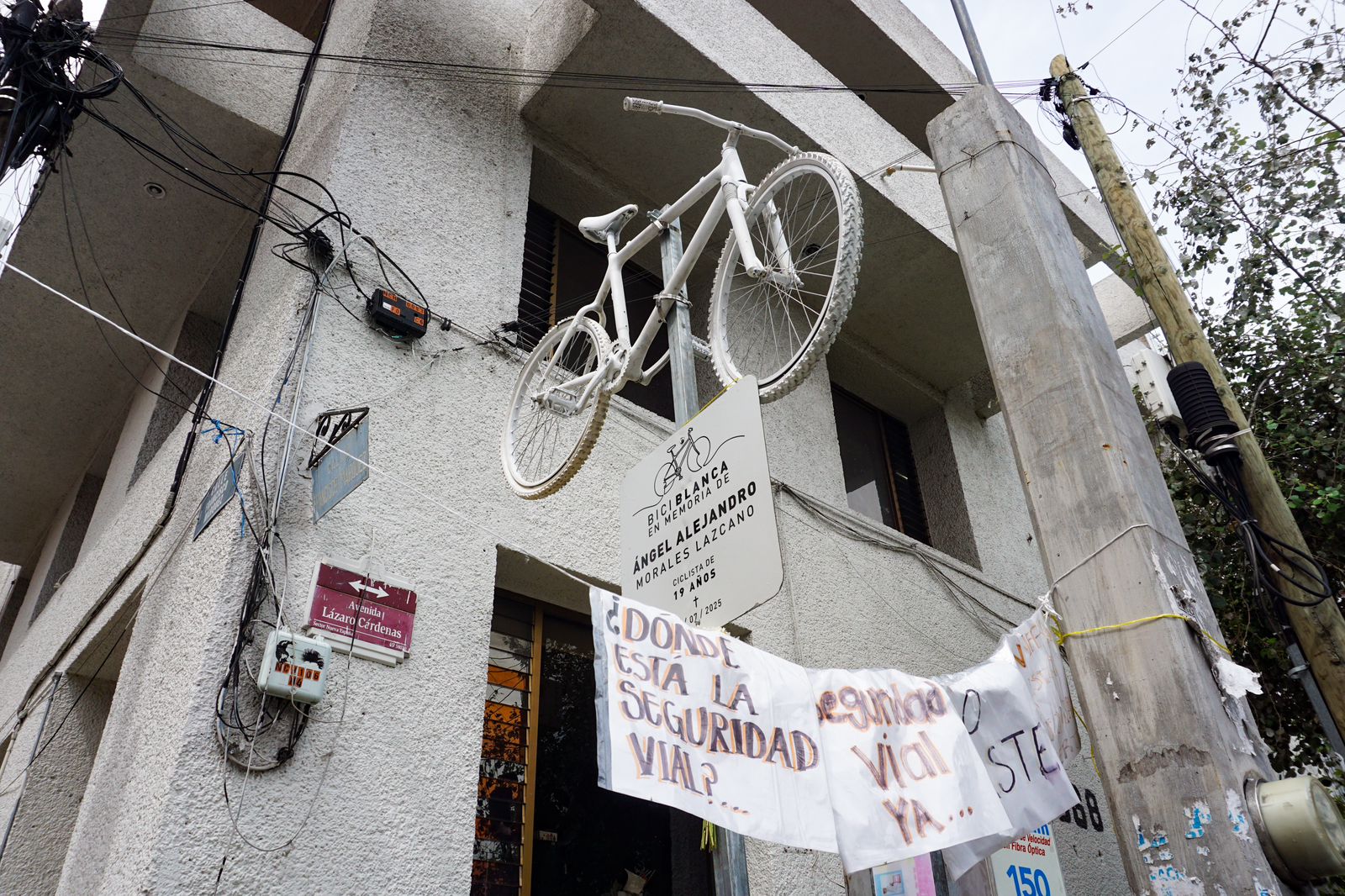 Morelia, Mich. I Alfredo Soria/ACG.- Para que su memoria no se olvide, una bicicleta blanca fue colocada por la comunidad ciclista en la esquina de Lázaro Cárdenas y Francisco Márquez. Ángel Alejandro, un joven ciclista de 19 años, perdió la vida en ese lugar tras ser atropellado por un camión. La bicicleta blanca es un homenaje y un llamado urgente a la conciencia vial.