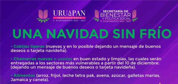 Morelia, Michoacán | Redacción.- El gobierno municipal de Uruapan a través de sus redes sociales compartió la invitación para la campaña de «Una Navidad Sin Frío» para apoyar a las personas vulnerables en situación de calle y a quienes más lo necesiten, pues en la temporada decembrina es cuando la temperatura más desciende y también es donde la solidaridad más se necesita.