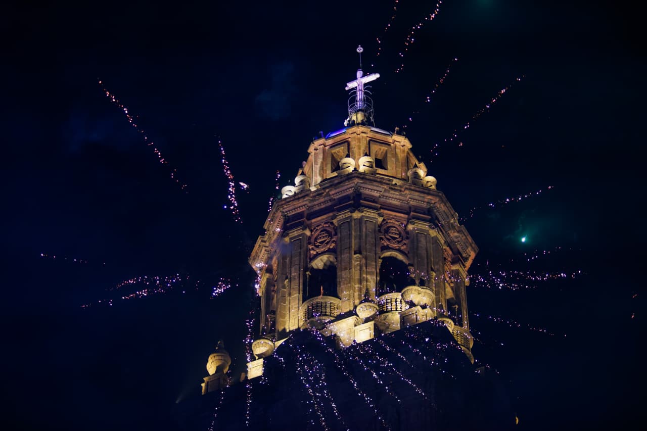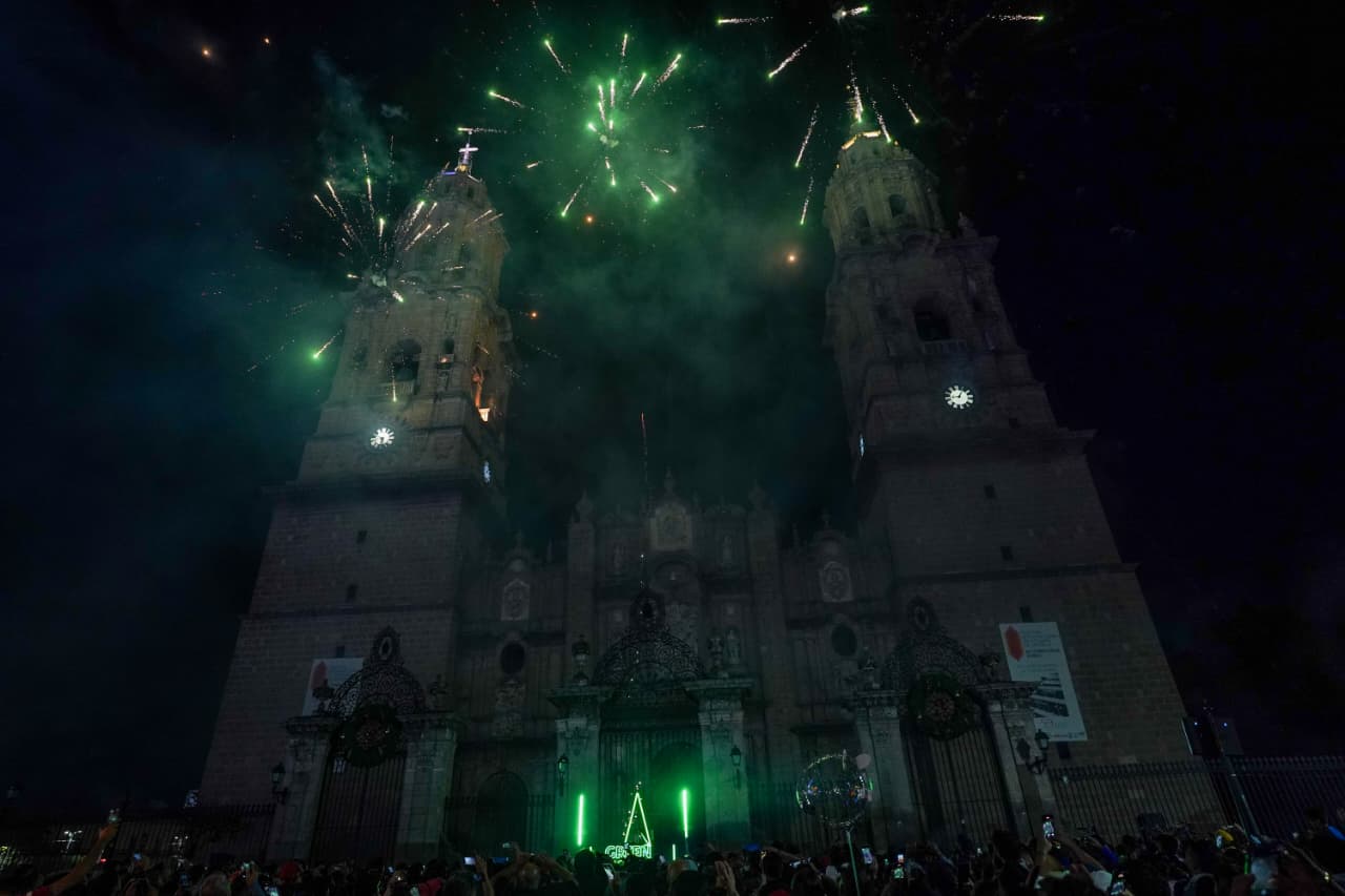 Morelia, Mich. | Agencia ACG.- En pleno Centro Histórico vivió una noche luminosa. En la avenida Madero cientos de visitantes en un ambiente festivo que mezcló música electrónica y proyecciones visuales como antesala al esperado encendido del templo.