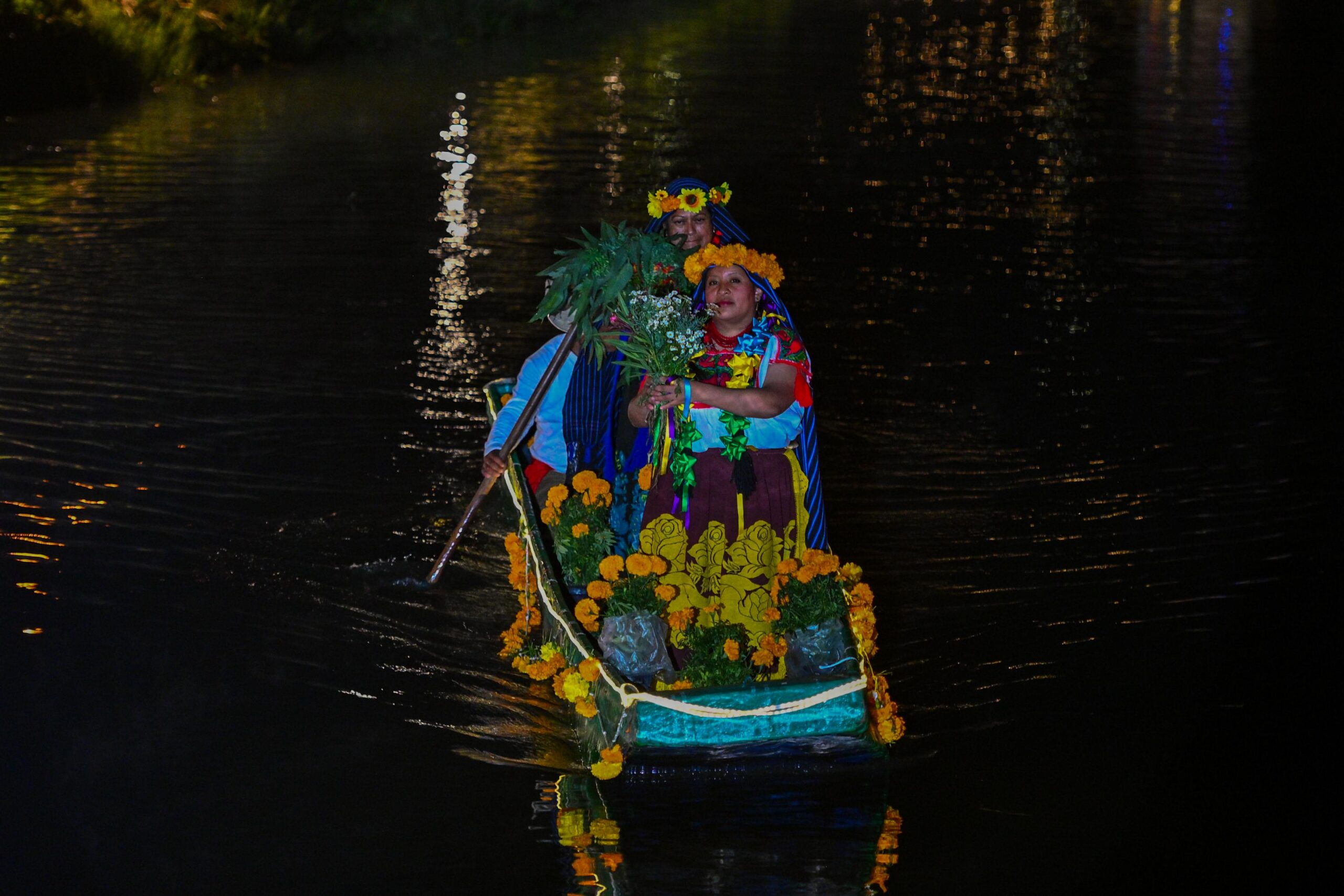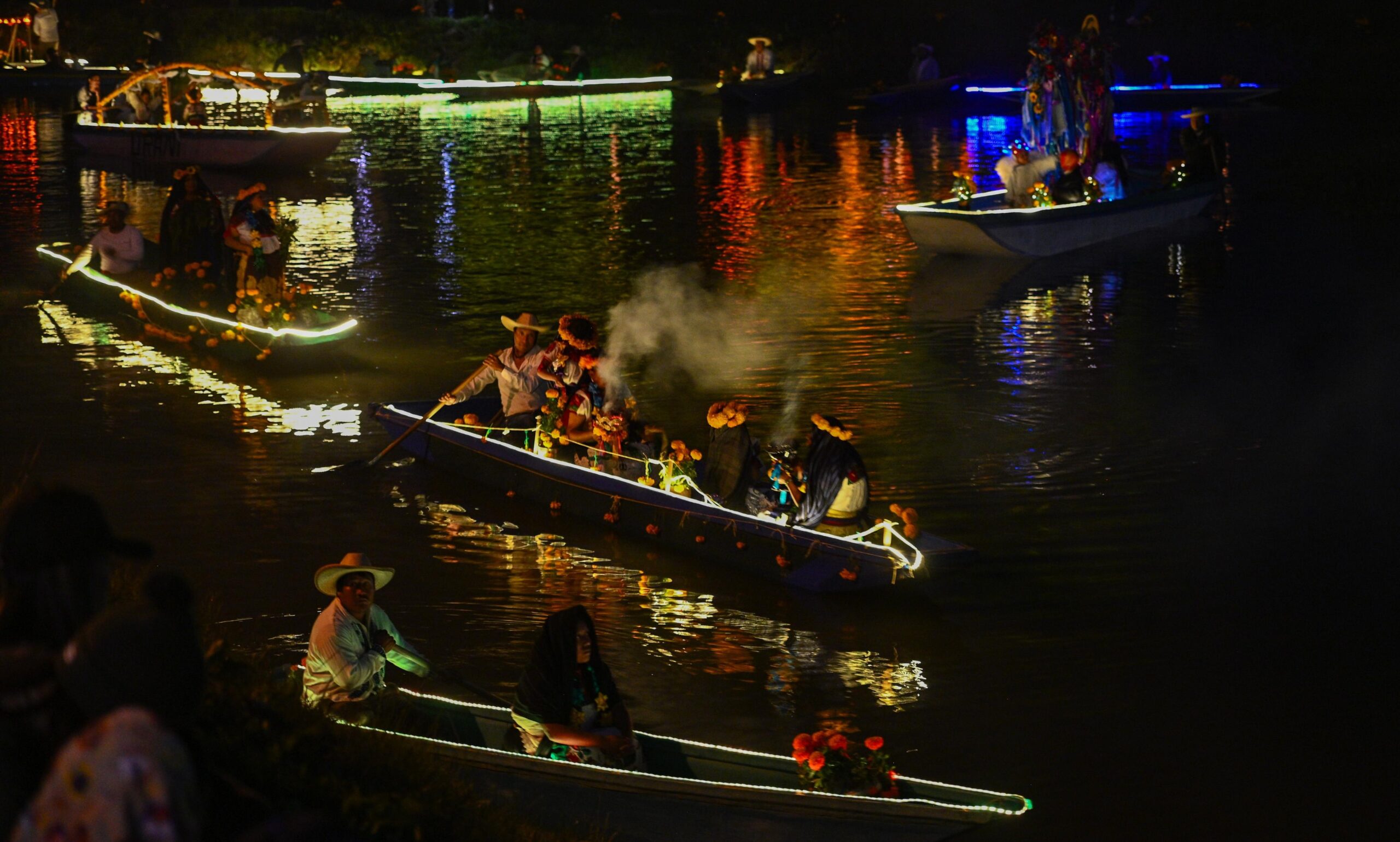 Los habitantes, ataviados con trajes blancos bordados en colores vivos, sombreros de palma y rebozos oscuros, avanzaban en su canoa junto a niños disfrazados de diablitos y ángeles, en una representación viva del ciclo entre la vida y la muerte.