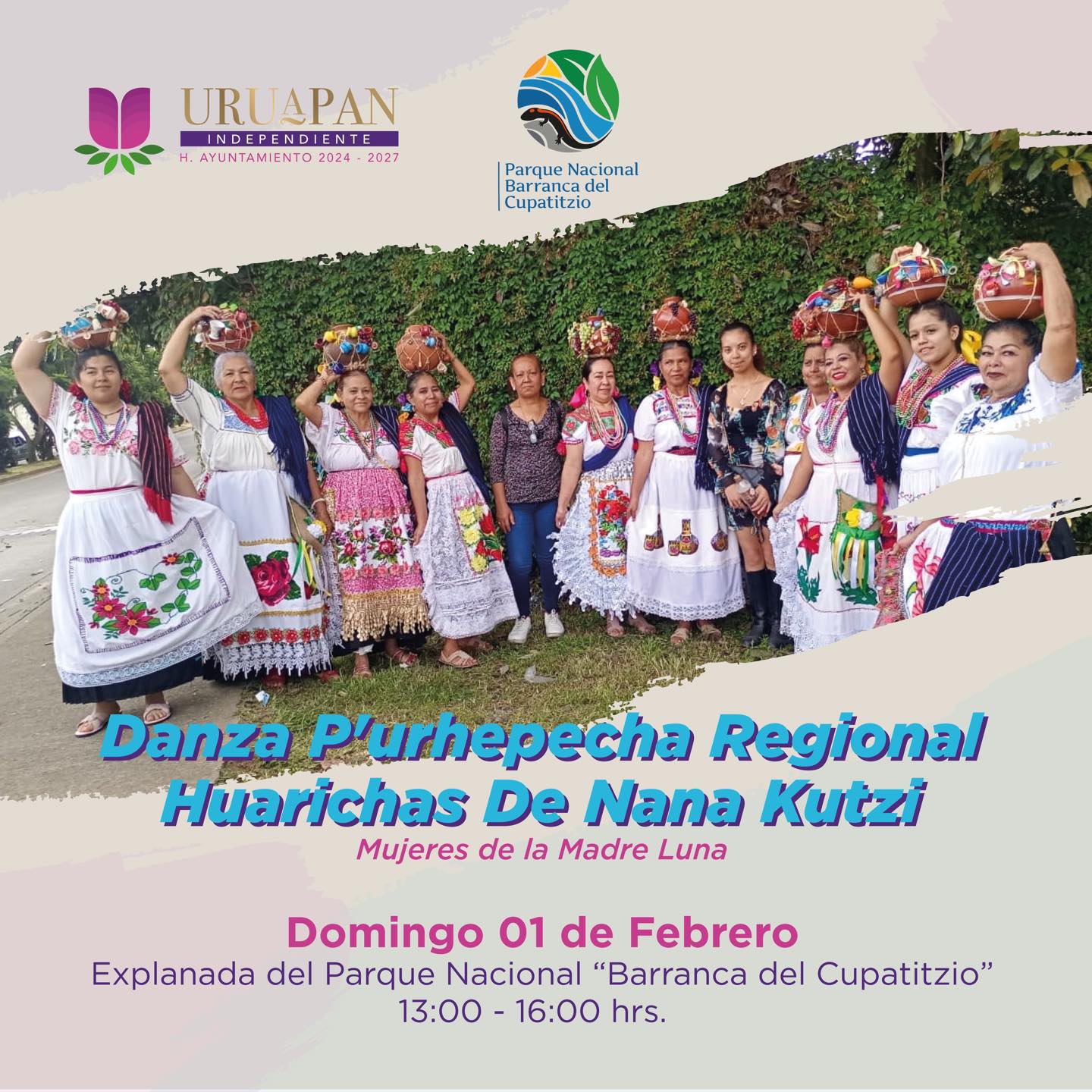 Uruapan, Mich., a jueves 29 de Enero de 2026 | Redacción. – Con el objetivo de promover la riqueza cultural y las tradiciones de la región, el Gobierno Municipal de Uruapan anunció la presentación de la Danza P’urhépecha Regional “Huarichas de Nana Kutzi” (Mujeres de la Madre Luna). El evento se llevará a cabo el próximo domingo 1 de febrero en la explanada del Parque Nacional Barranca del Cupatitzio.