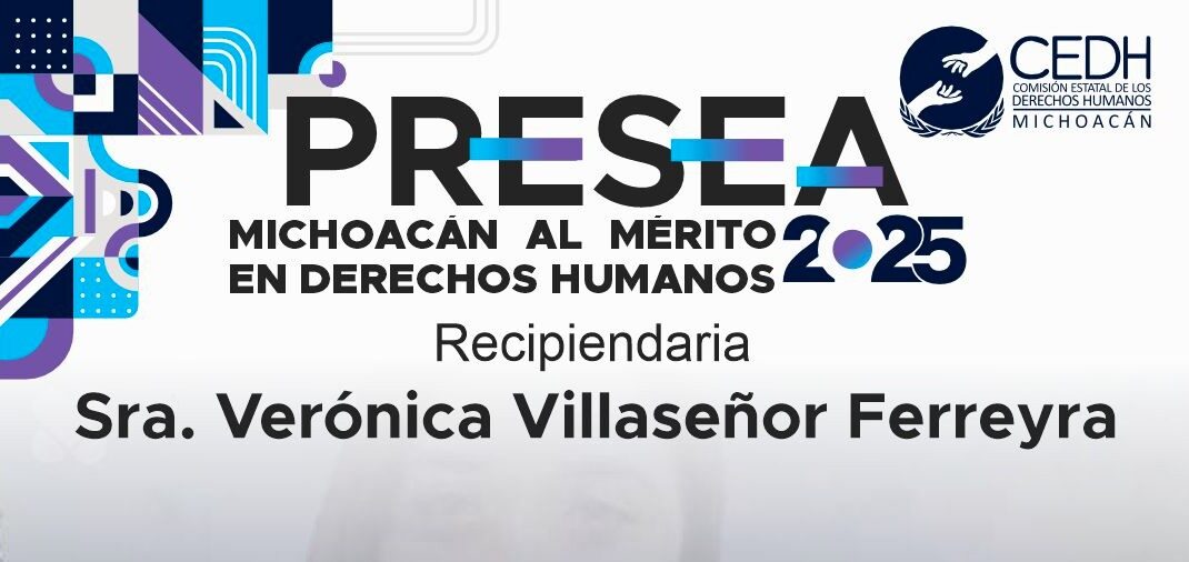 Morelia, Michoacán.- 9 de diciembre de 2025.- Por su incansable defensa de los derechos humanos, su firme búsqueda de justicia para la maestra Jéssica y su labor en visibilizar y acompañar a víctimas de feminicidio, la Comisión Estatal de los Derechos Humanos (CEDH) otorgará a la señora Verónica Villaseñor Ferreyra, la Presea Michoacán al Mérito en Derechos Humanos 2025.