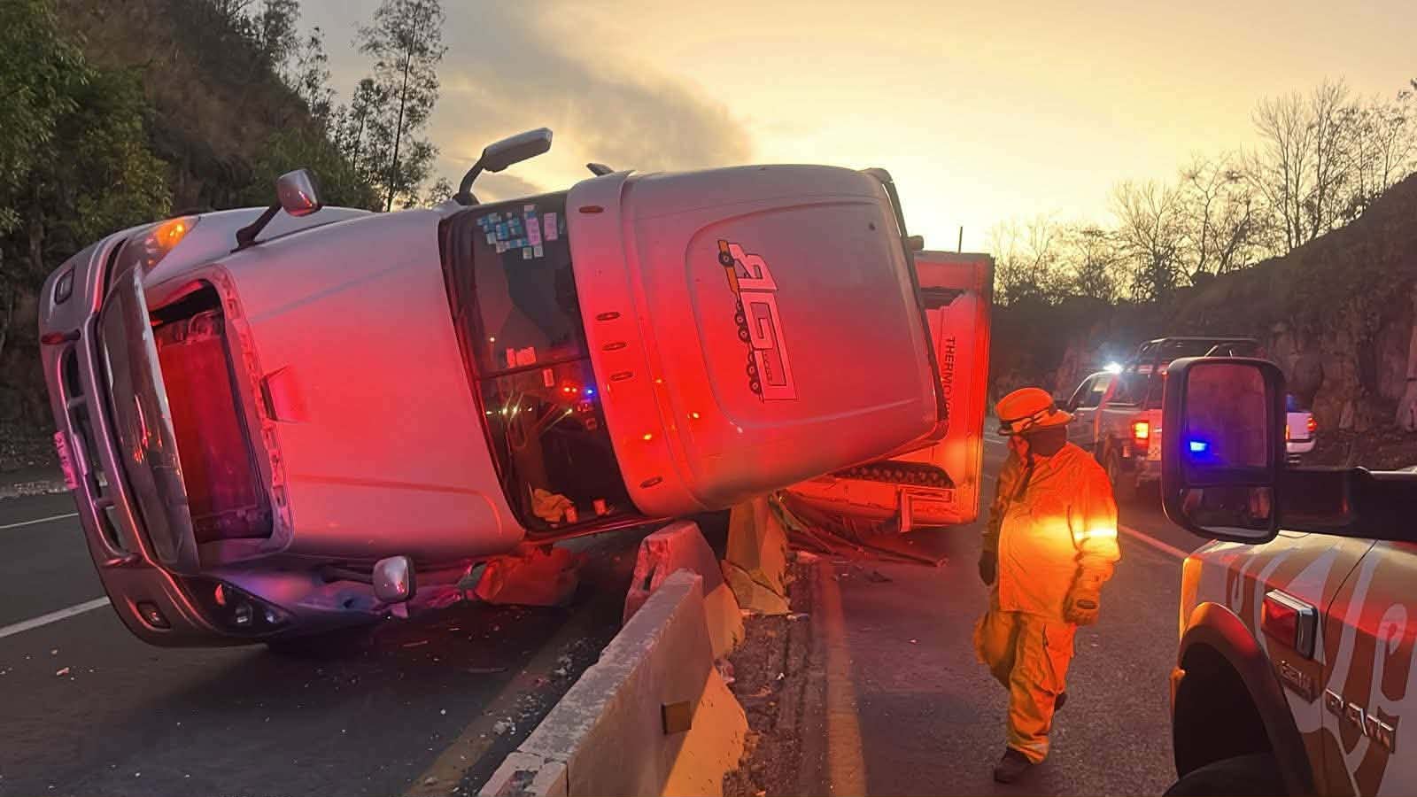 El percance ocurrió en el sitio conocido como Subida Cepamisa, en las inmediaciones de la entrada al fraccionamiento Arcos San Pedro. La pesada unidad, al volcar, cayó sobre los bloques de concreto de contención central.
