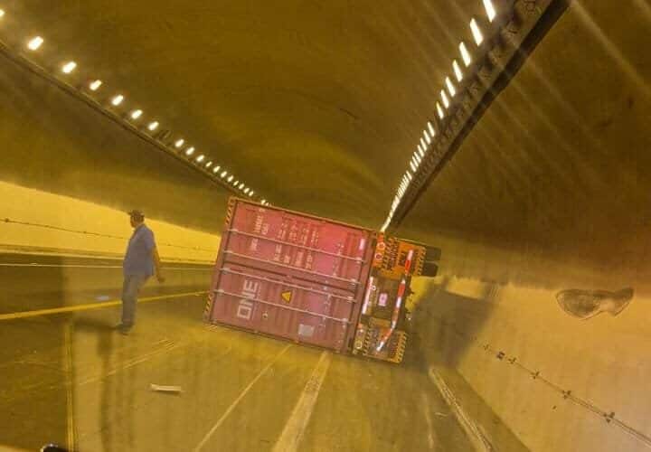 Copándaro de Galeana, Mich.-Viernes 12 de diciembre de 2025.- Un tractocamión volcó dentro de un túnel de la autopista Pátzcuaro-Cuitzeo, hecho que ocurrió durante la mañana de este viernes, a la altura del municipio de Copándaro de Galeana.