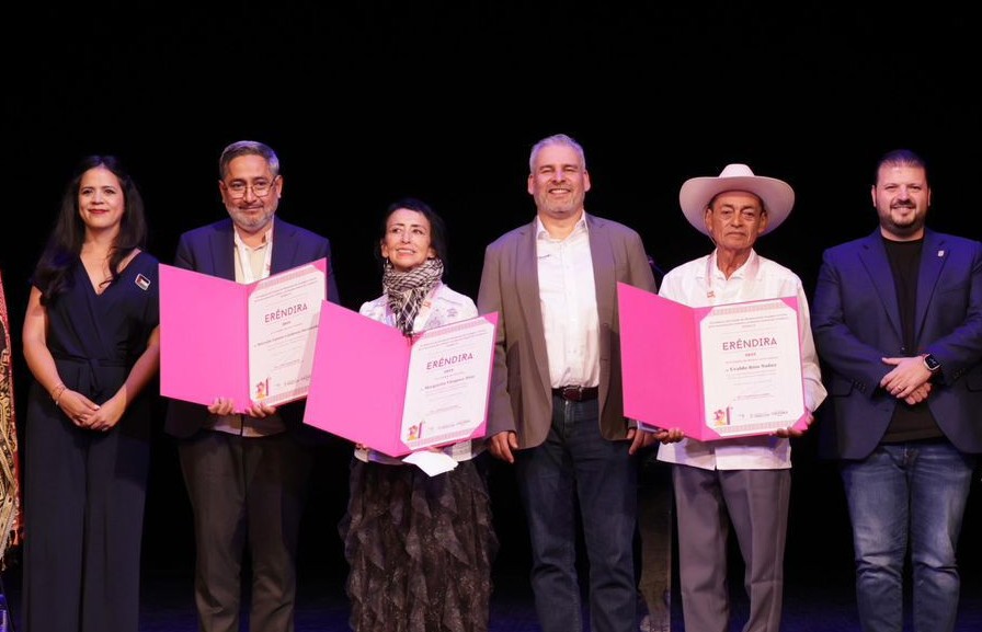 “Hoy el símbolo de Eréndira cobra vida entre nosotros y se encarna en estos tres grandes artistas cuyas obras son un legado que trasciende fronteras y engrandece lo mejor de nuestro Michoacán. Su arte es un tesoro invaluable, un acto de resistencia creativa que protege y expresa las raíces culturales y la identidad de nuestro pueblo”, expresó.